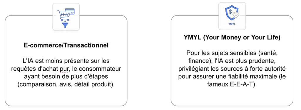 Les sites proposant des contenus factuels ou informatifs (recettes, tutoriels, définitions) sont les plus exposés à la perte de trafic, leurs informations étant souvent directement aspirées par l’IA Overview. Cependant, certains secteurs sont plus « protégés » :